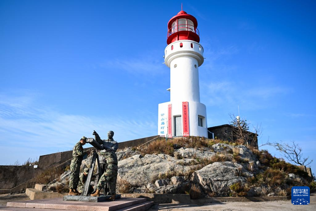 开山岛守岛民兵保养清洁王继才雕像(10月25日摄)。新华社记者 邓华 摄
