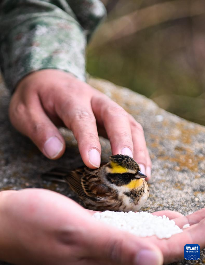 开山岛守岛民兵用大米喂养受伤小鸟(10月25日摄)。新华社记者 邓华 摄