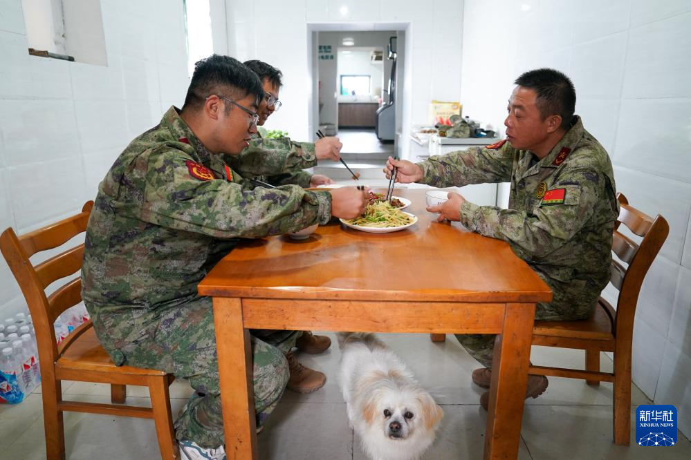 开山岛守岛民兵孙存东(右)、李富明(左)、王凯洋在厨房里吃饭(10月25日摄)。新华社记者 李博 摄