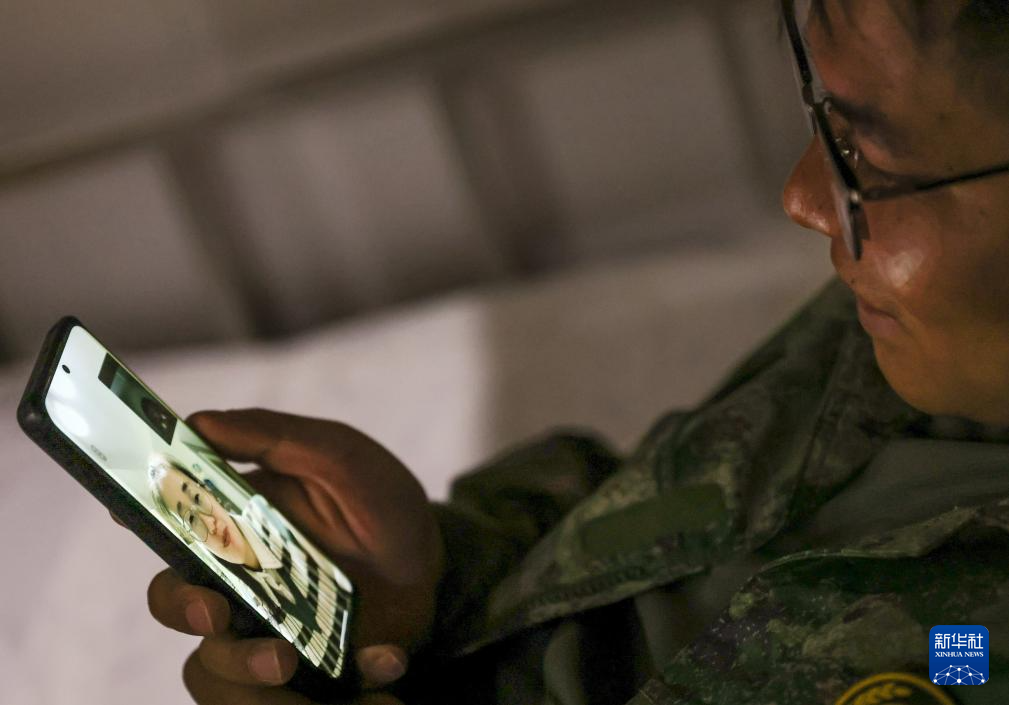 开山岛守岛民兵王凯洋在和女朋友视频通话(10月25日摄)。新华社记者 吕帅 摄