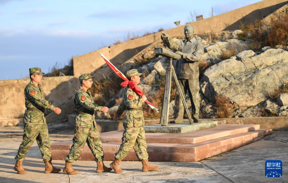 开山岛守岛民兵孙存东、王凯洋、李富明(从右至左)升旗路上经过王继才雕像(10月26日摄)。新华社记者 邓华 摄