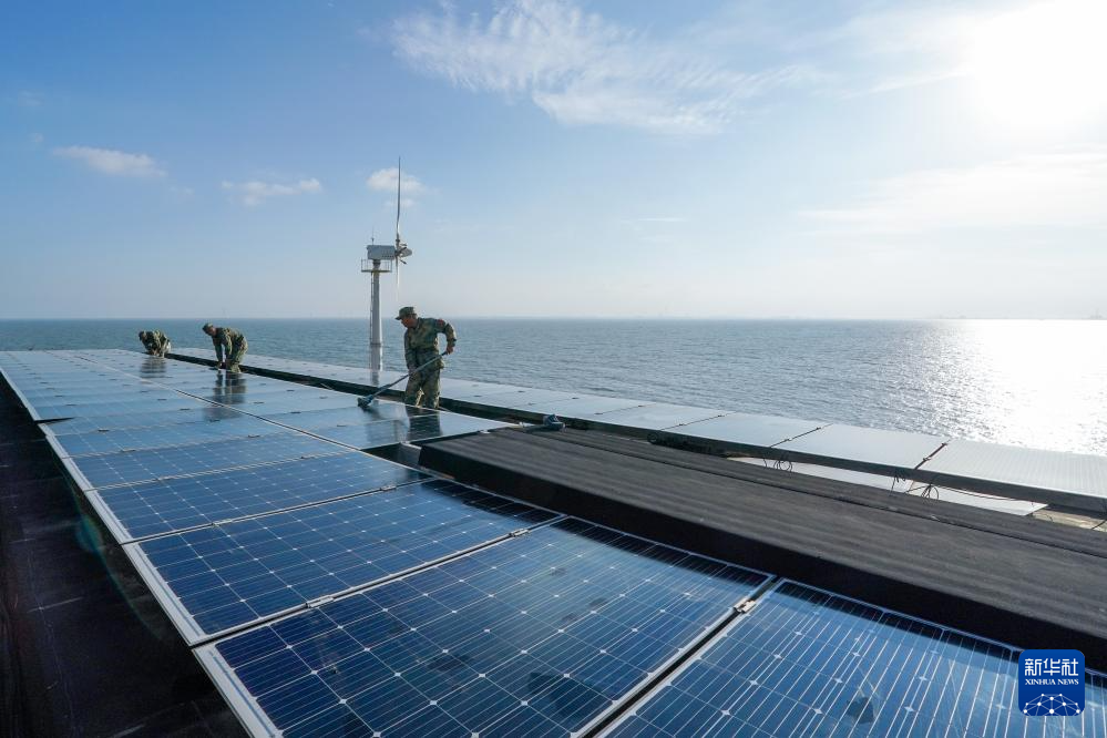 开山岛守岛民兵清洁太阳能光伏板(10月25日摄)。新华社记者 李博 摄