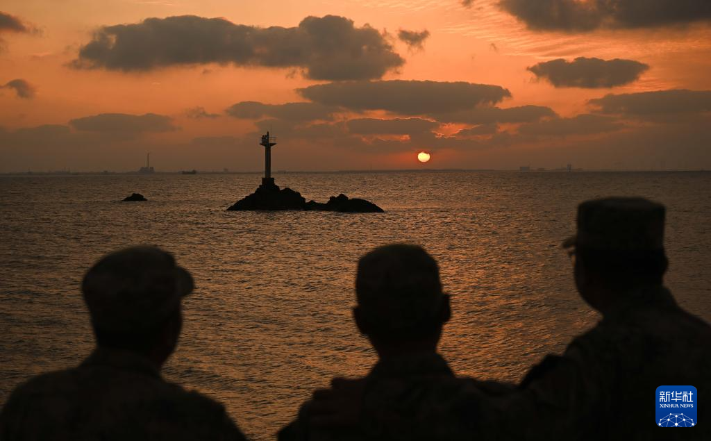 开山岛守岛民兵欣赏海上落日(10月25日摄)。新华社记者 邓华 摄