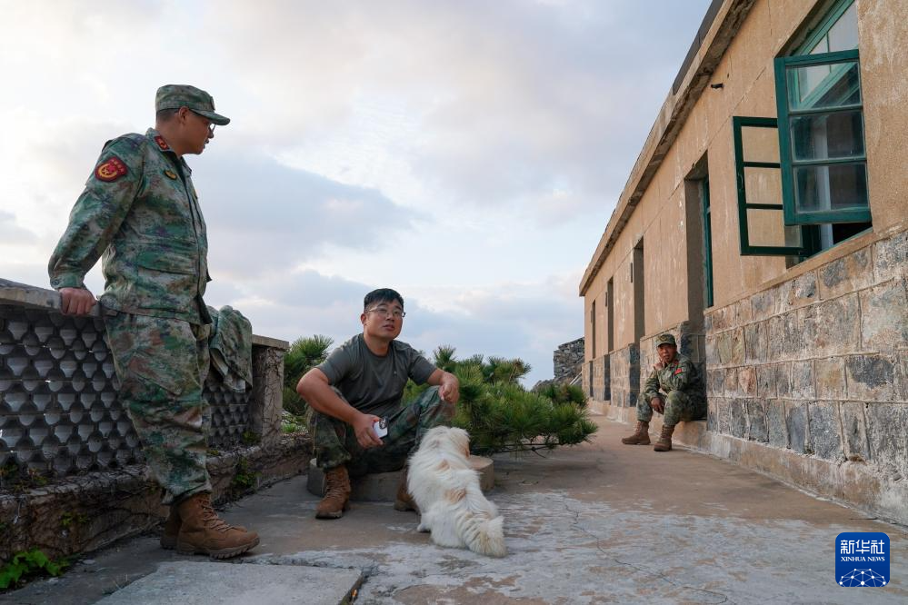开山岛守岛民兵孙存东(右)、王凯洋(左)、李富明休息时聊天(10月25日摄)。新华社记者 李博 摄