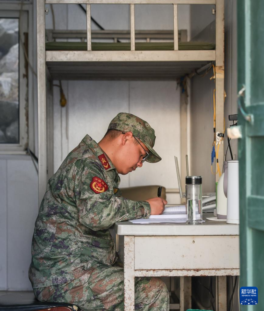 开山岛守岛民兵王凯洋记录执勤情况(10月25日摄)。新华社记者 吕帅 摄