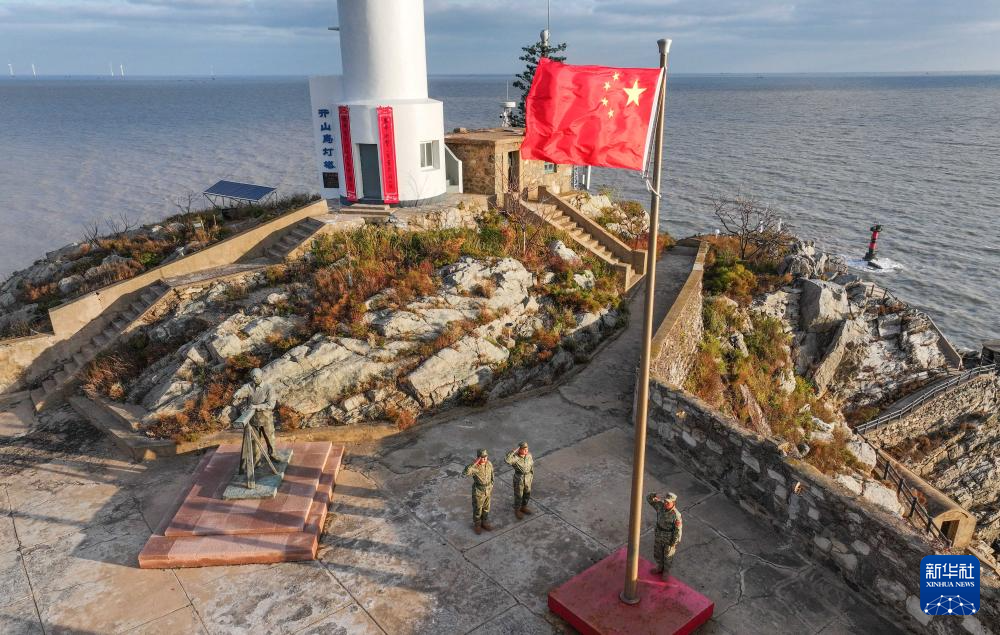 开山岛守岛民兵迎着朝阳举行升旗仪式(10月26日摄,无人机照片)。新华社记者 吕帅 摄