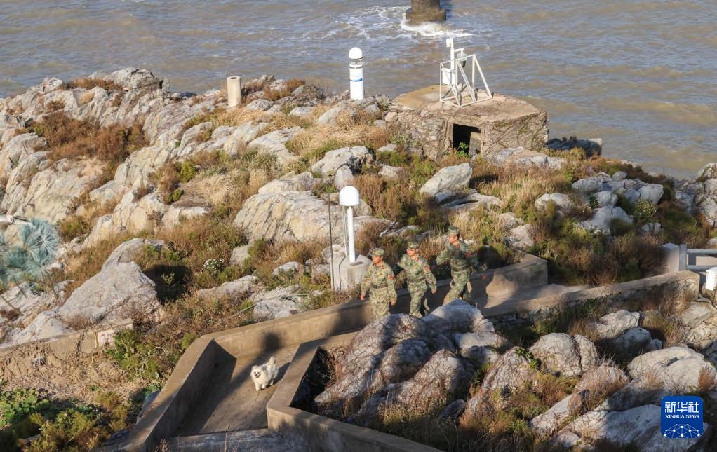 开山岛守岛民兵孙存东、王凯洋、李富明(从左至右)在巡岛路上(10月25日摄)。新华社记者 吕帅 摄
