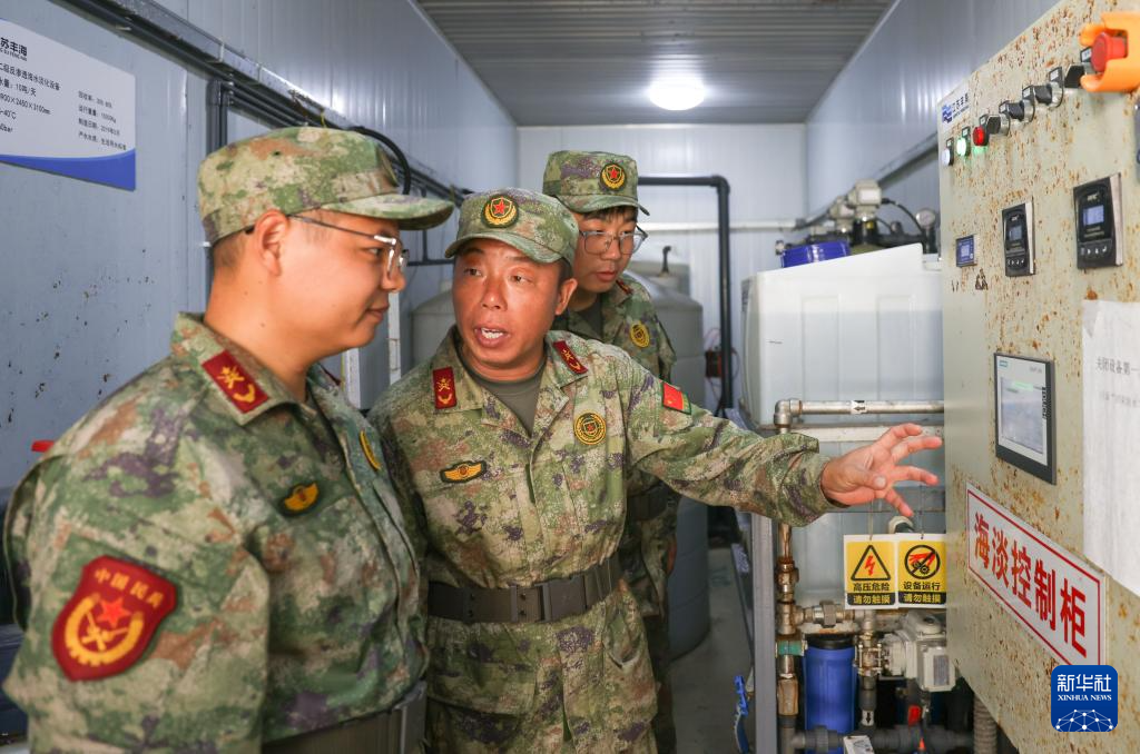 开山岛守岛民兵孙存东(中)、王凯洋(前)、李富明检查海水淡化装置(10月25日摄)。新华社记者 吕帅 摄