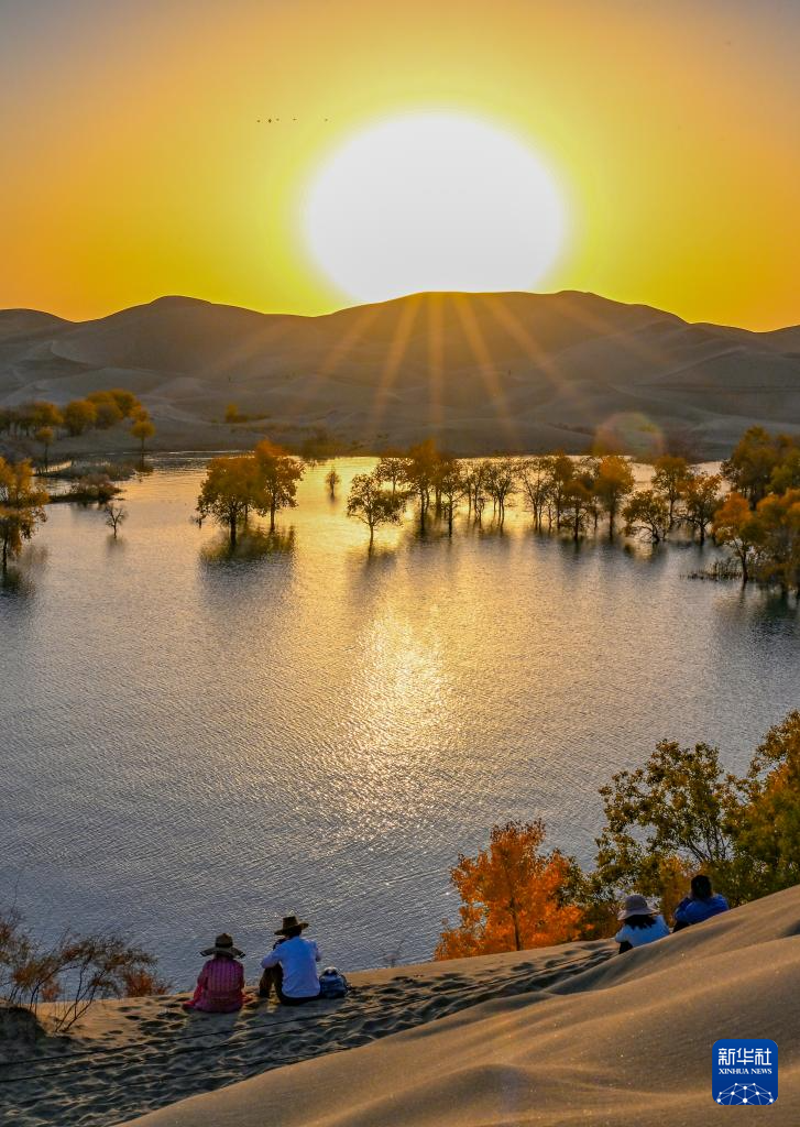 这是葫芦岛景区内落日中的胡杨林和沙山(10月25日摄)。