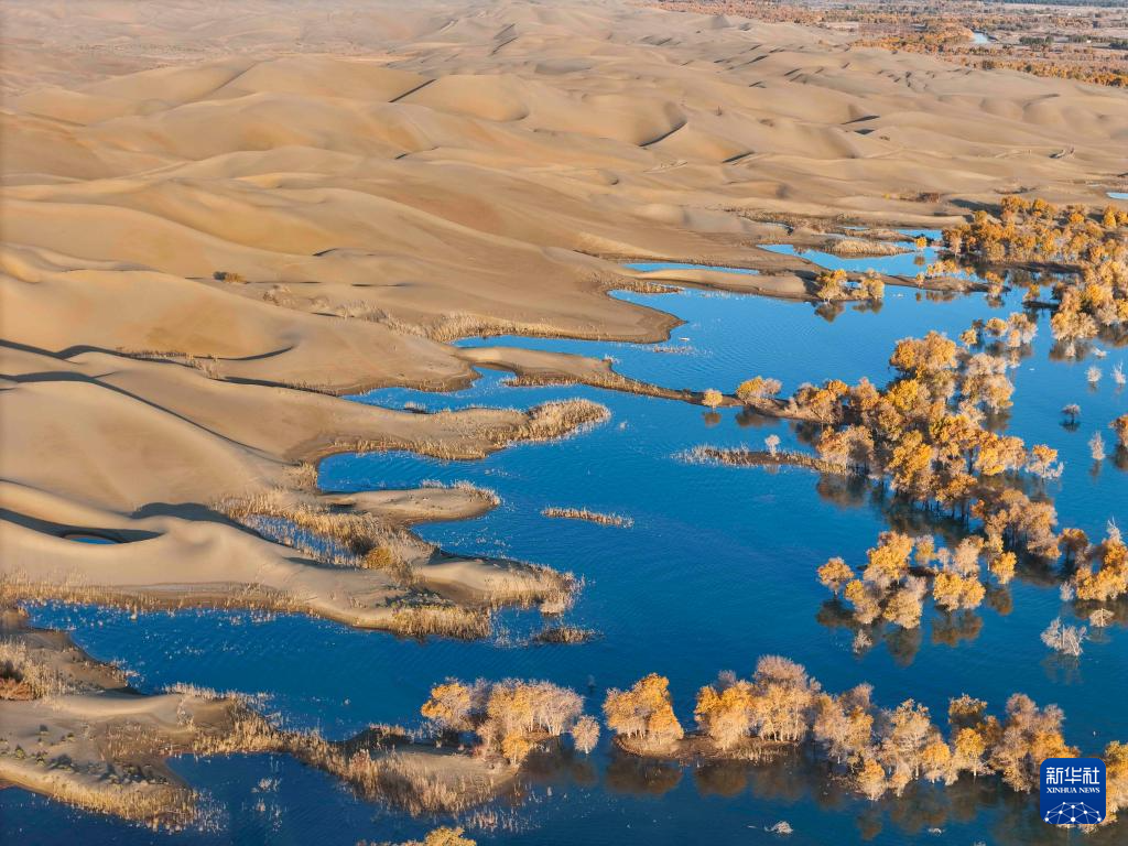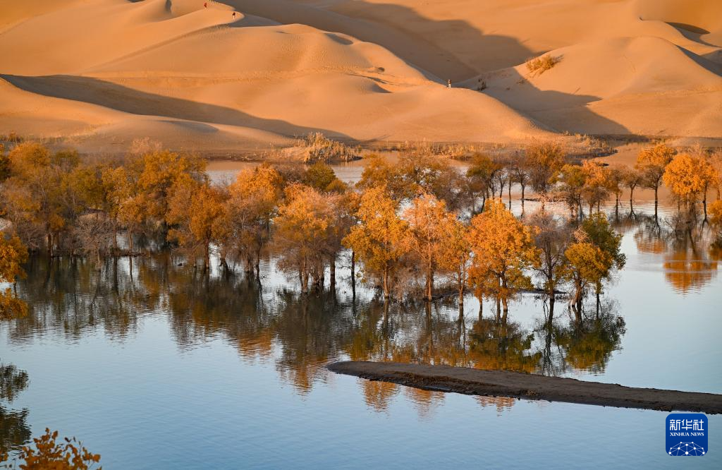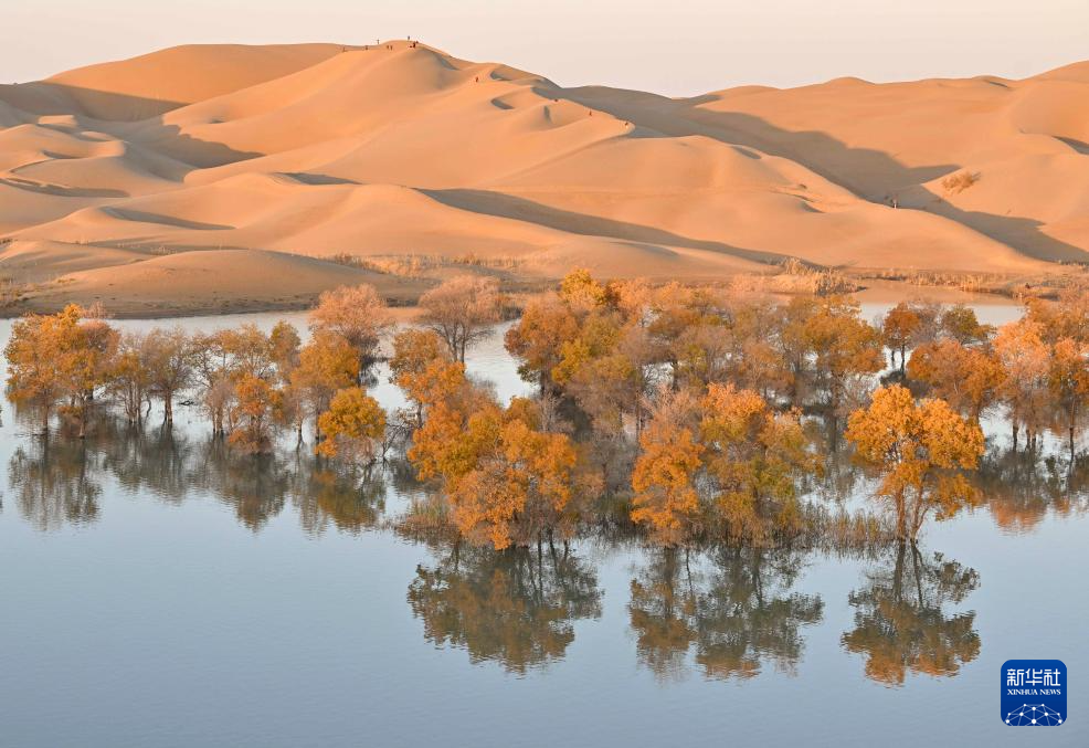 这是葫芦岛景区内胡杨林和沙山(10月26日摄)。