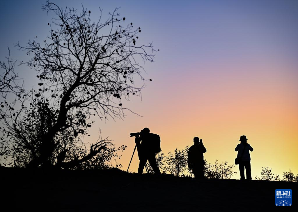 游客在葫芦岛景区内沙山上观赏落日中的胡杨(10月25日摄)。