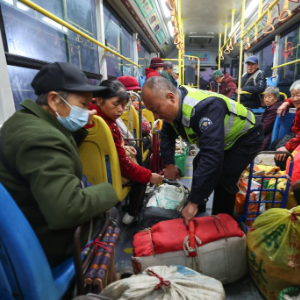10月28日,在湖北省襄阳市505路公交车“爱心菜农专线”上,志愿者帮助菜农整理公交车上的蔬菜包裹。