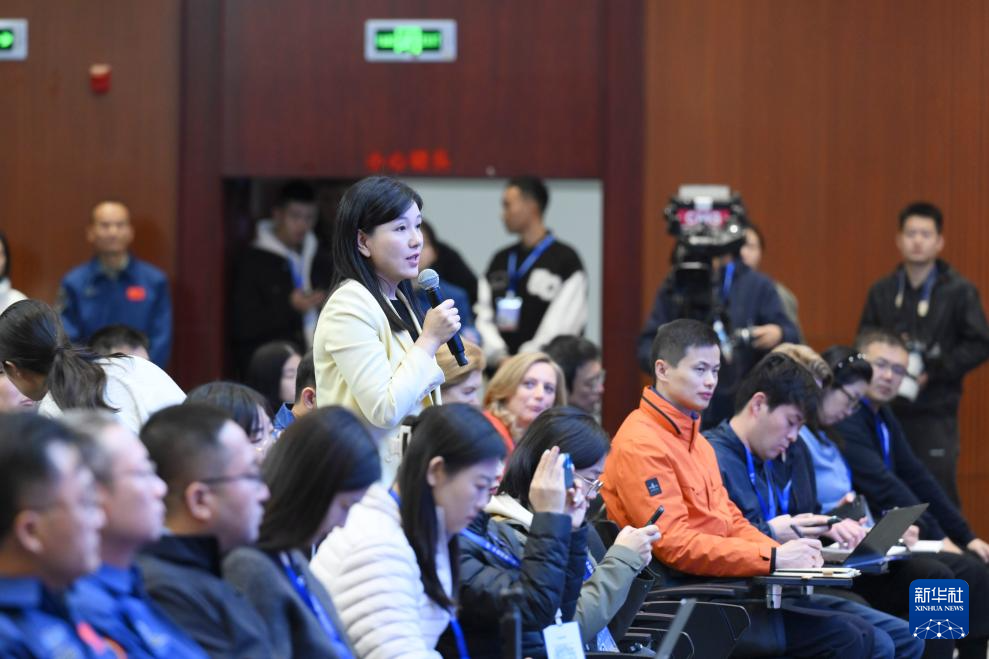 10月29日,神舟十九号载人飞行任务新闻发布会在酒泉卫星发射中心召开。这是记者在现场提问。