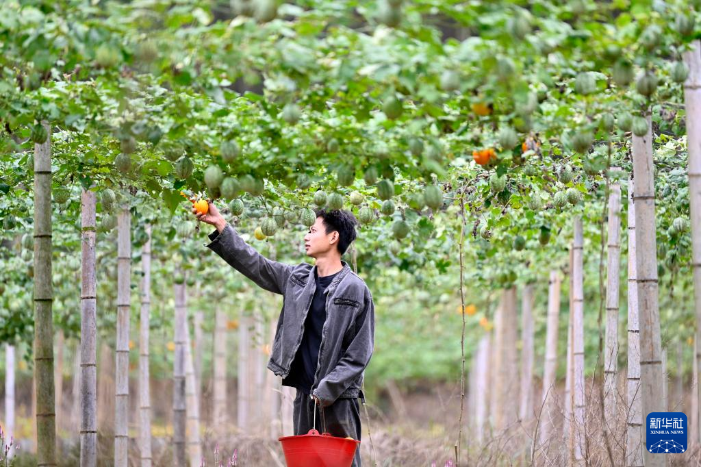 10月29日,在广西柳州市鹿寨县拉沟乡,工人在中药材种植基地里采摘吊瓜。
