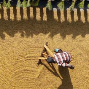 10月29日,在广西德保县城关镇那造村,村民在晾晒稻谷。
