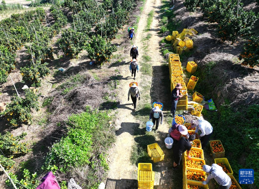 10月30日,村民在西林县那劳镇洞坚村运送采摘的金秋沙糖桔(无人机照片)。