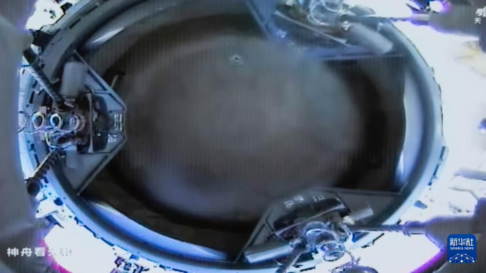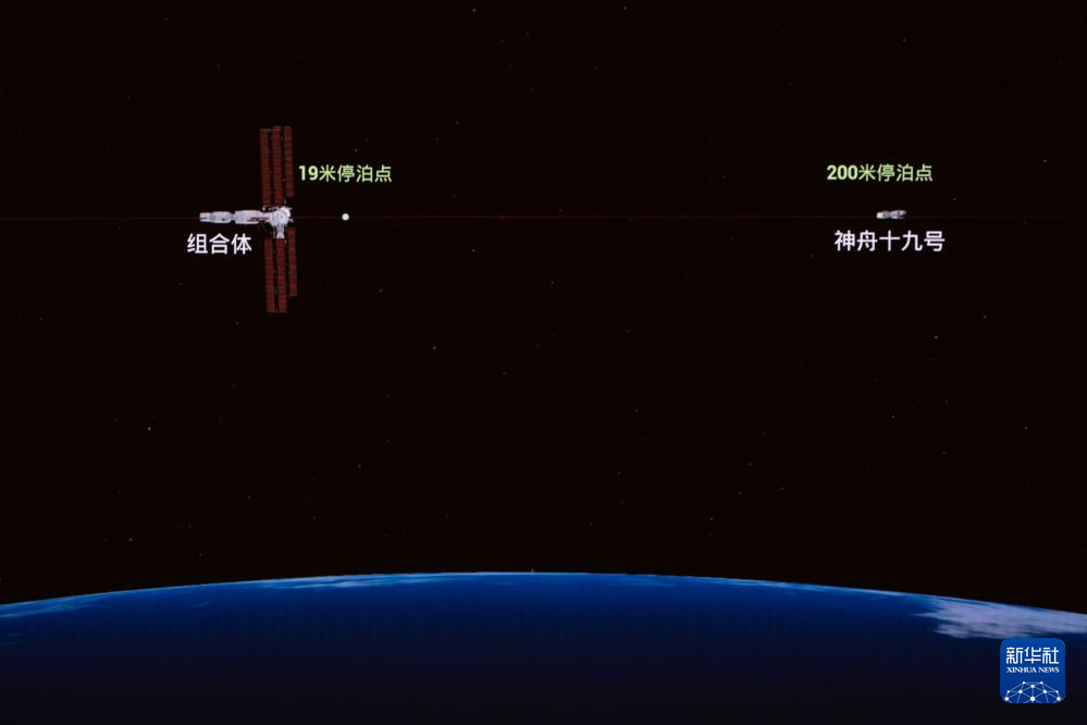 10月30日在北京航天飞行控制中心拍摄的神舟十九号载人飞船和空间站天和核心舱前向端口对接过程的画面。