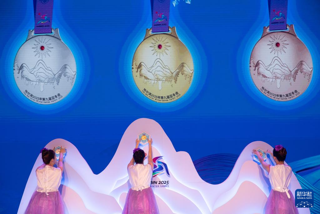10月30日,活动现场大屏幕显示亚冬会奖牌“竞速精神”的正面。