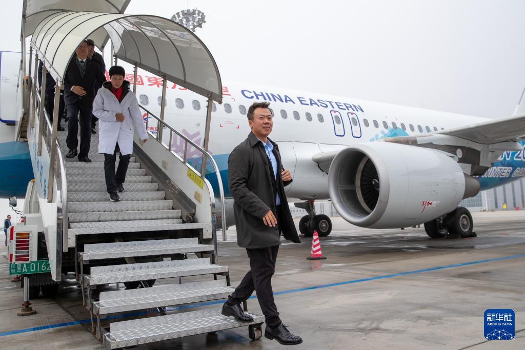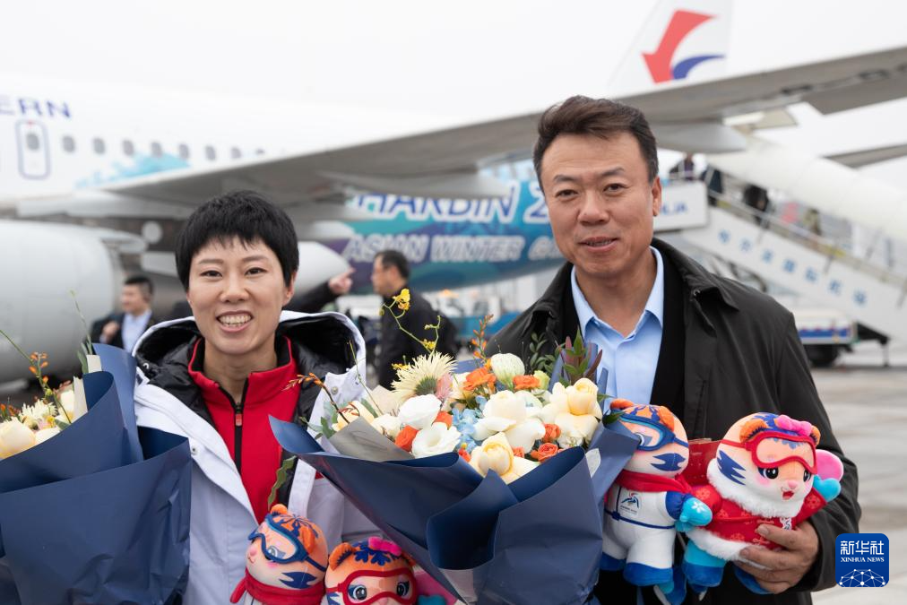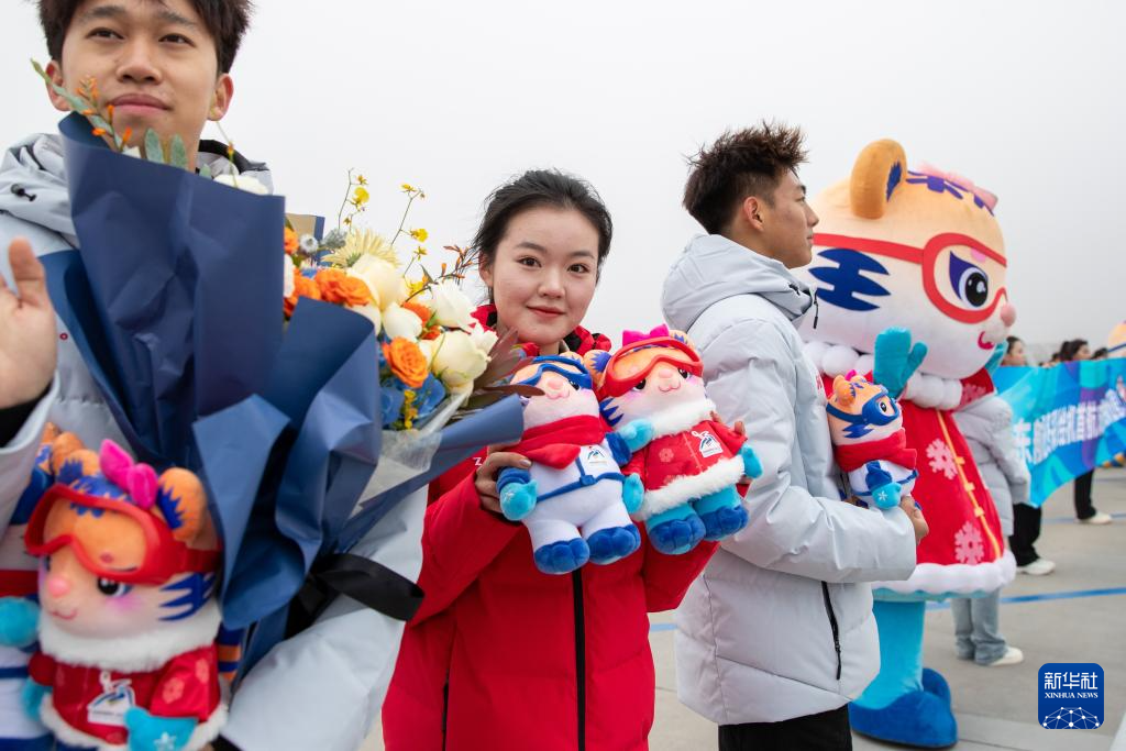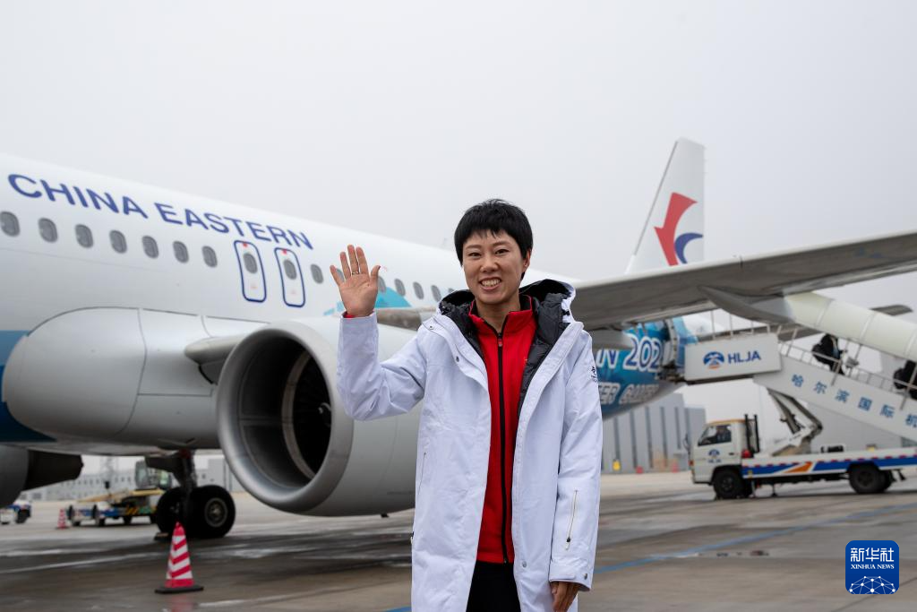 10月30日,在哈尔滨太平国际机场,冬奥冠军赵宏博(前)走下“亚冬号”彩绘机。