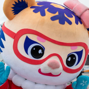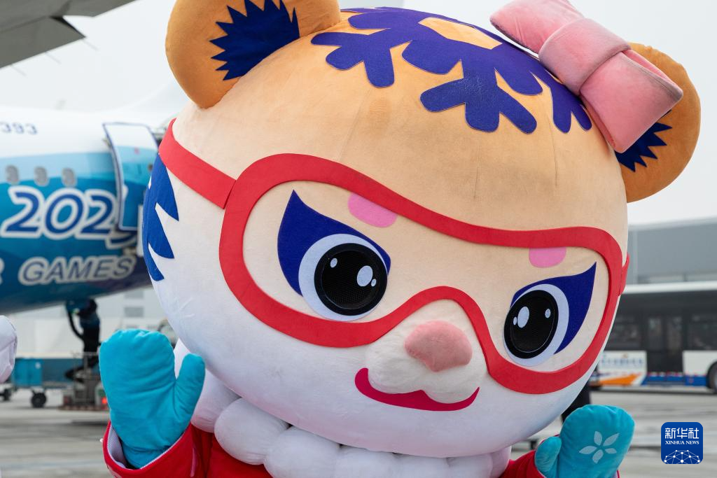 这是10月30日在哈尔滨太平国际机场欢迎仪式现场拍摄的亚冬会吉祥物“妮妮”。
