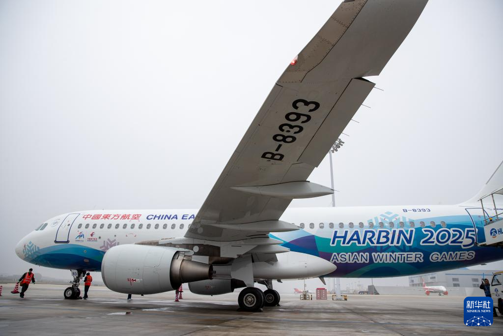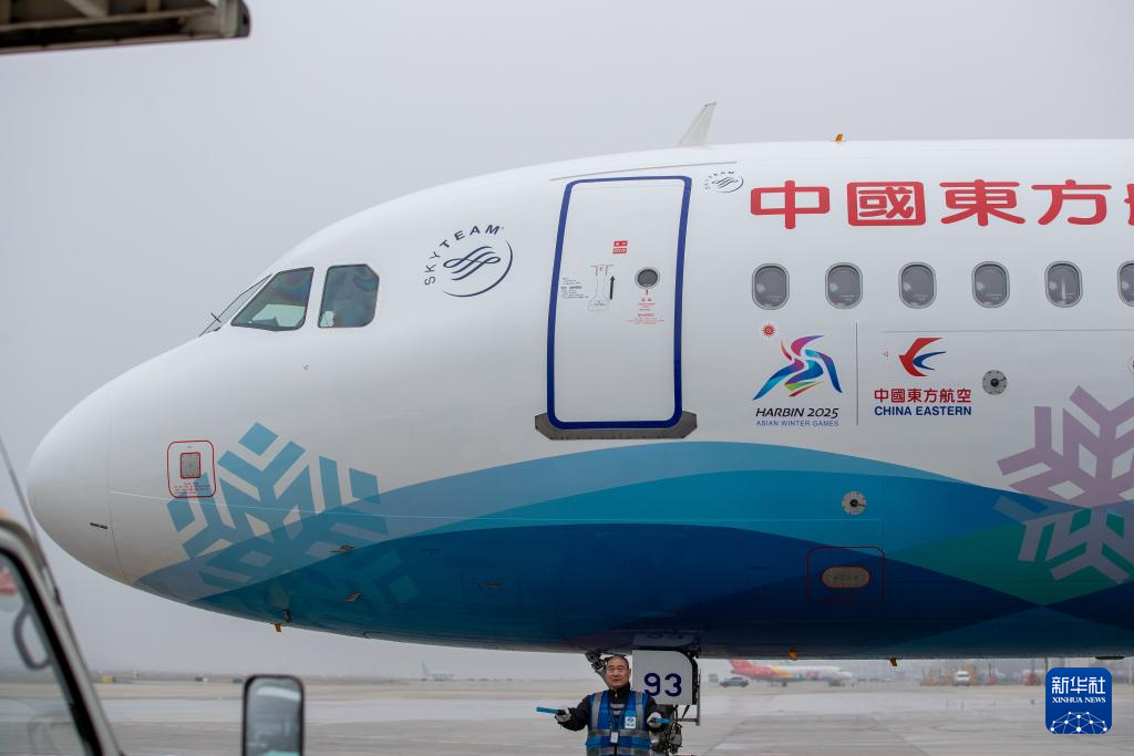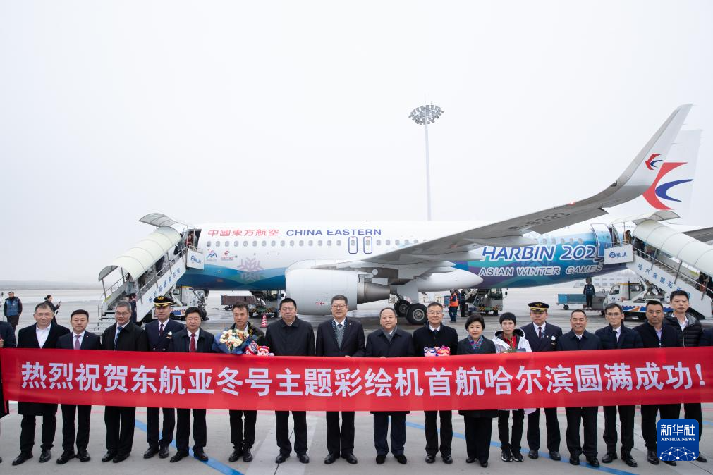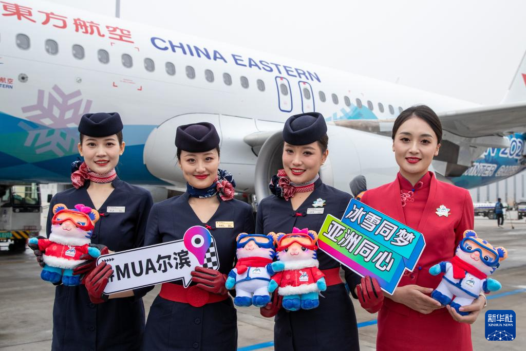当日,东航首架“亚冬号”彩绘机执飞MU6347航班,搭载首航旅客从上海虹桥国际机场抵达哈尔滨太平国际机场。
