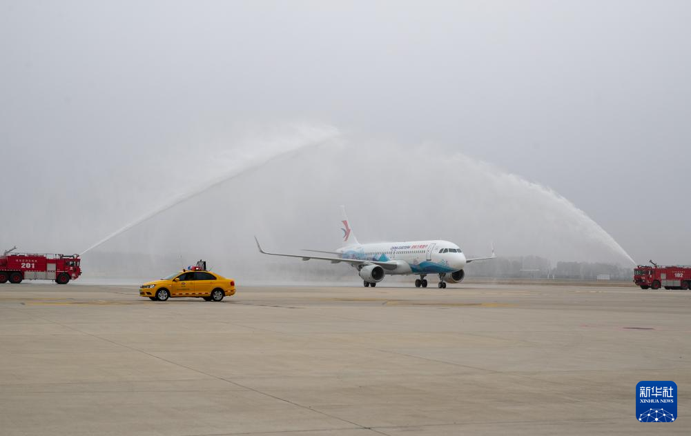 10月30日,在哈尔滨太平国际机场,“亚冬号”彩绘机穿过“水门”。