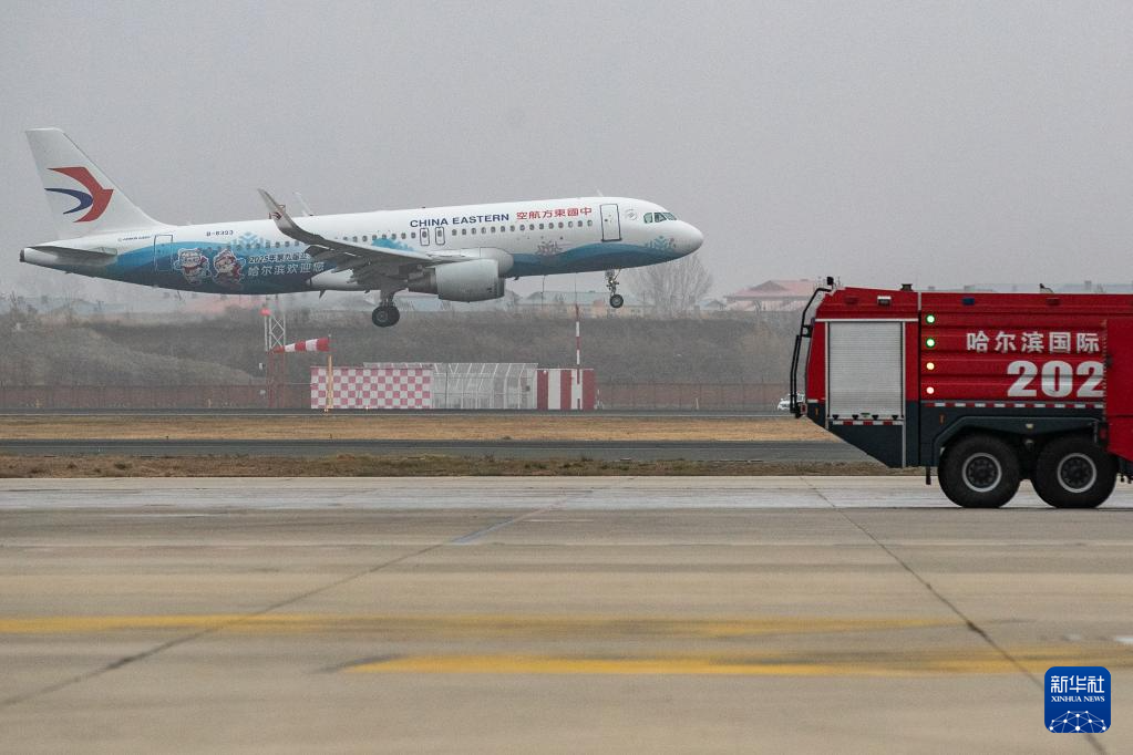 10月30日,在哈尔滨太平国际机场,“亚冬号”彩绘机准备降落。