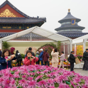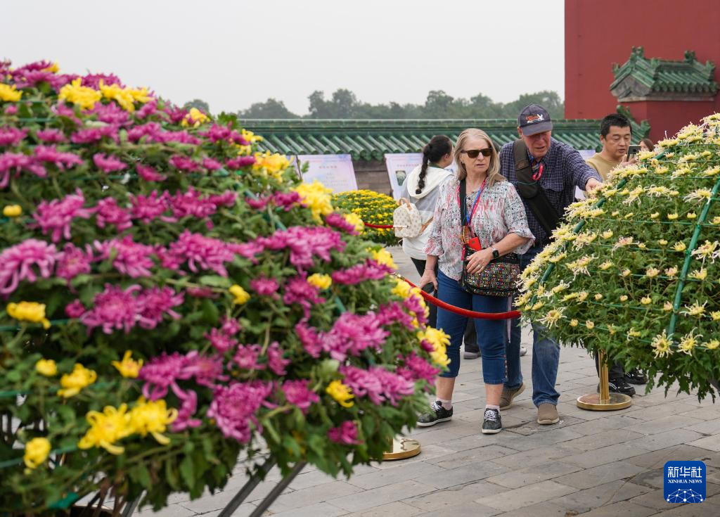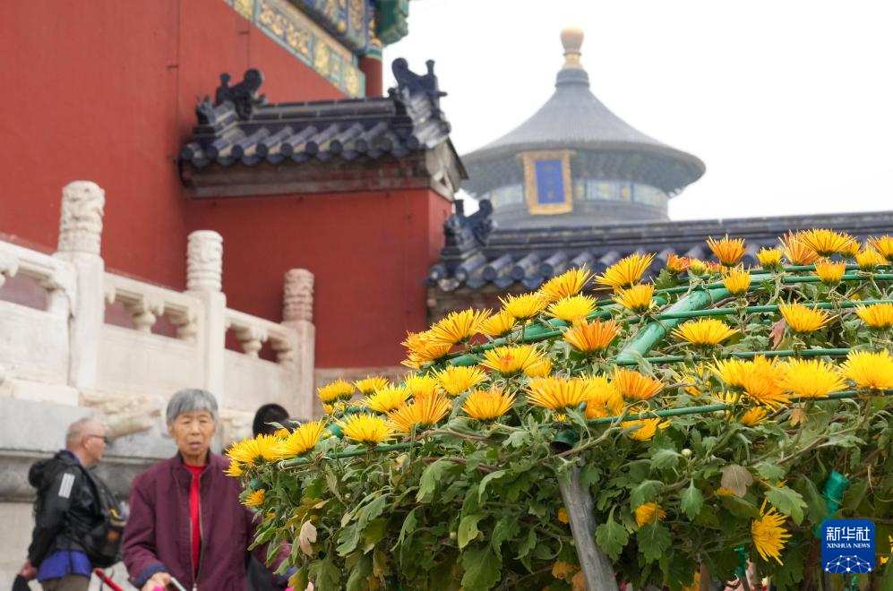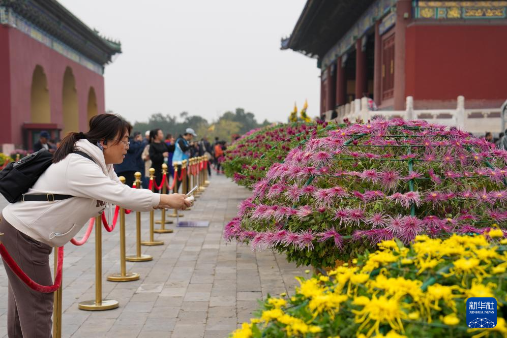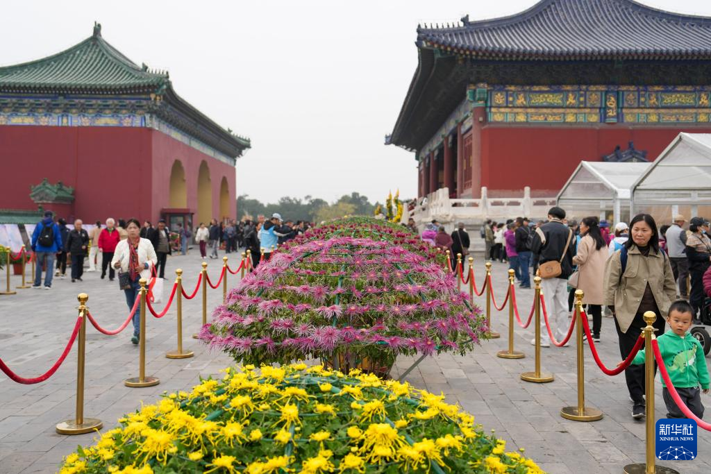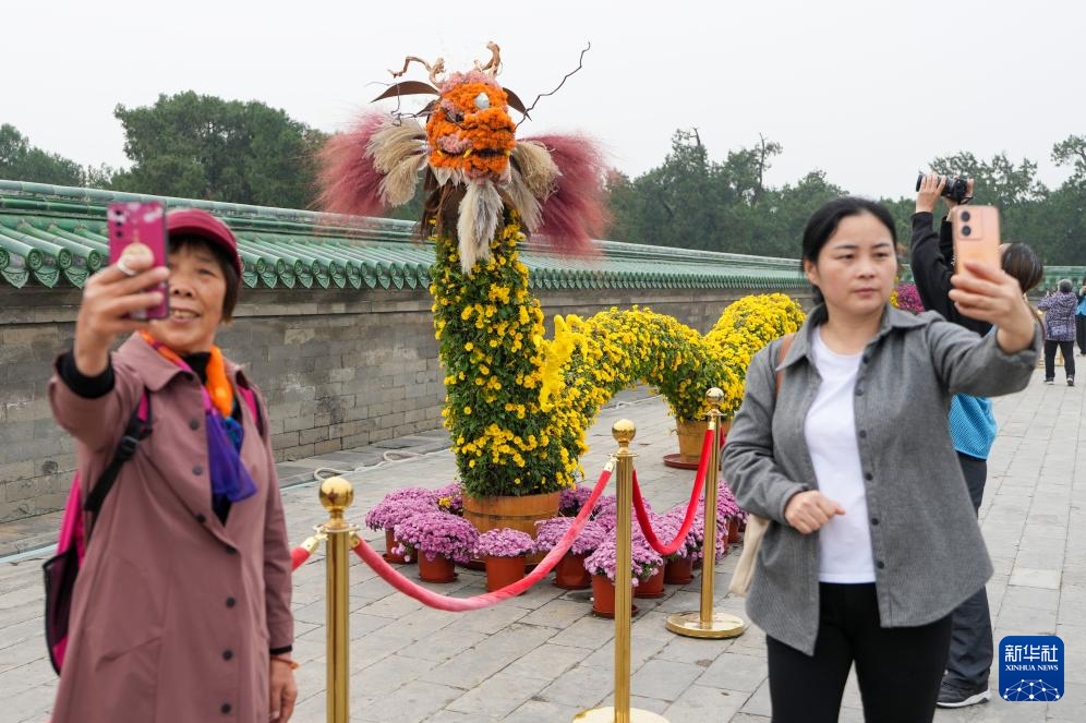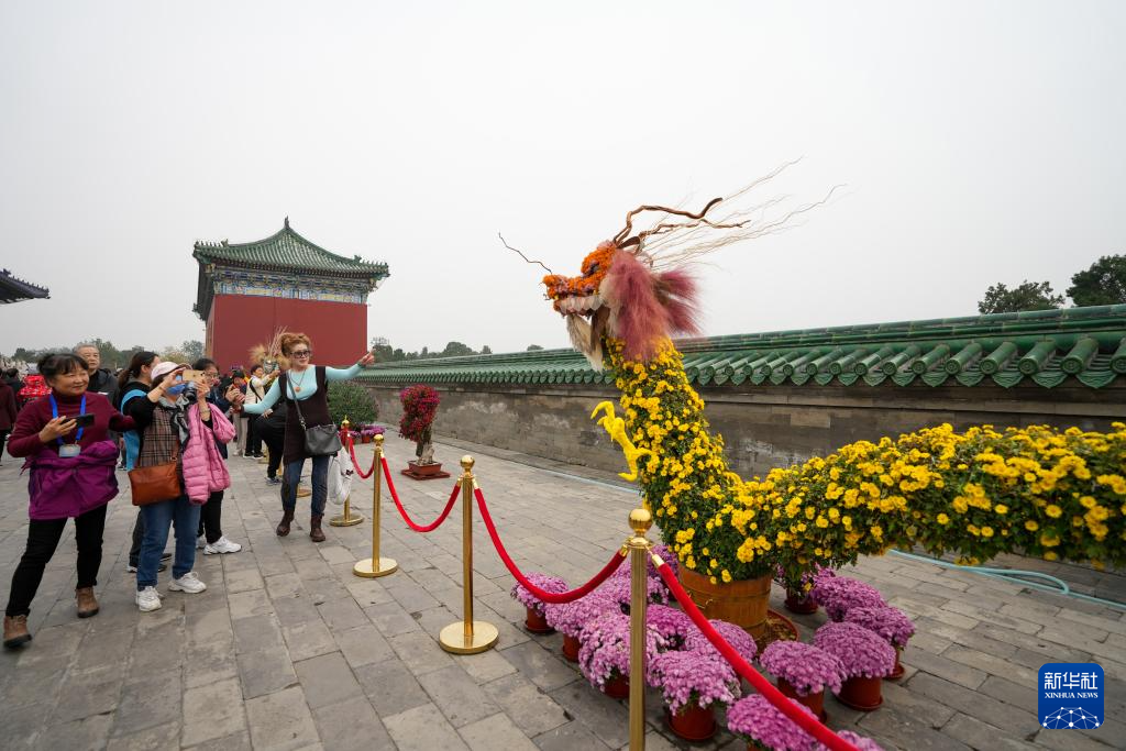 近日,天坛公园第43届菊花展开幕,本次菊花展主题为“龙腾盛世·菊舞芳华”,集中展示了独本品种菊、大立菊、悬崖菊、盆景菊、什锦菊、造型菊等中国传统菊花品种1万余盆,吸引众多游客前来参观赏花。