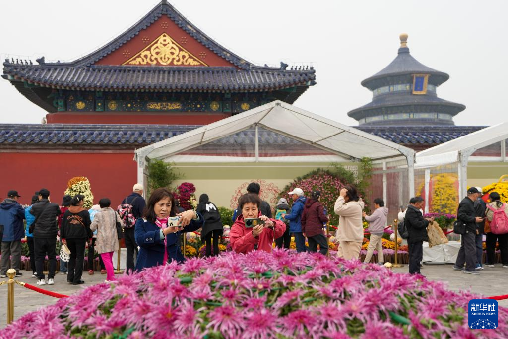 10月30日,游客在天坛公园欣赏展出的菊花。