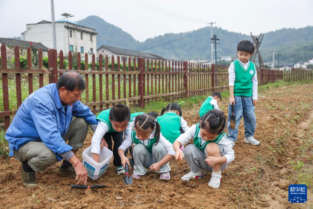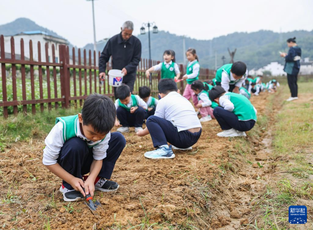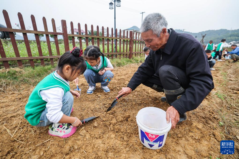 10月30日,参加研学游的诸暨荣怀和泰幼儿园的孩子们在璜山镇溪北村的农田里学习种玉米。