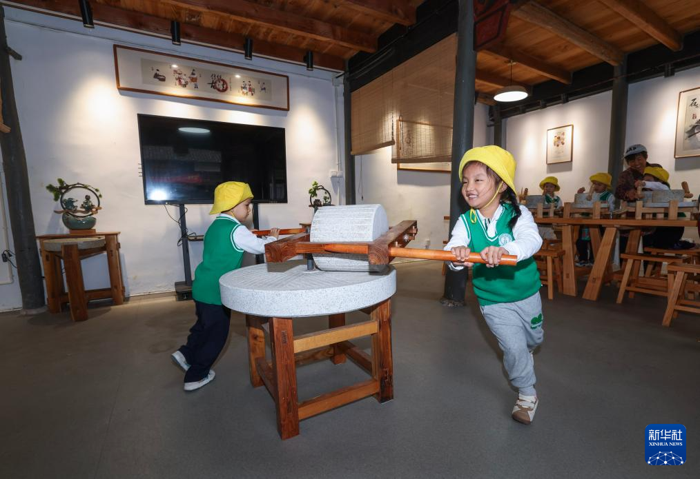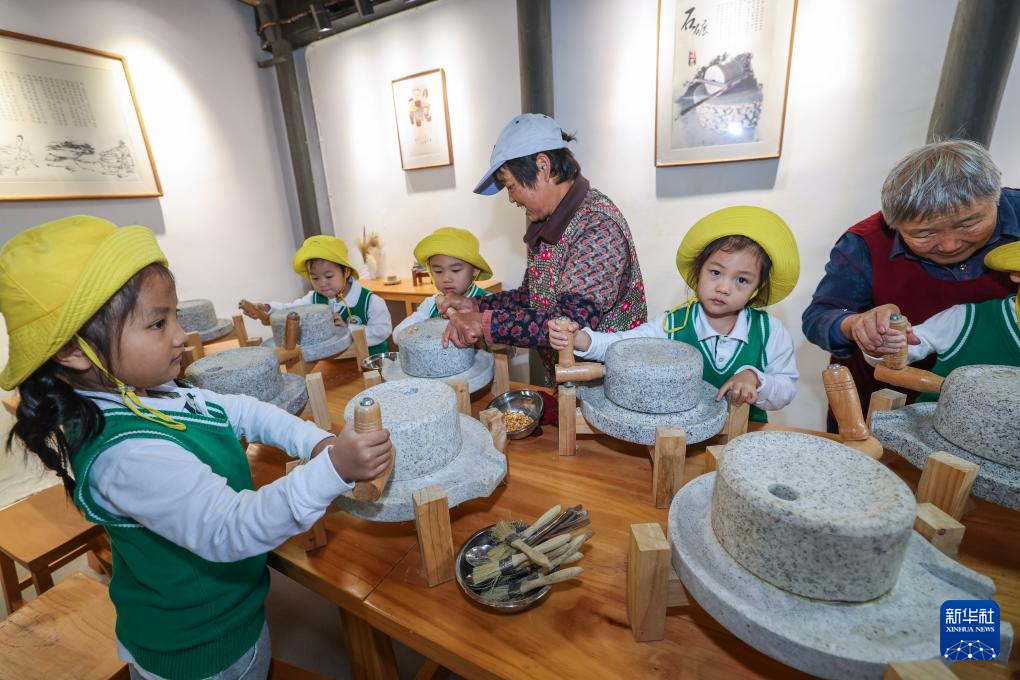 10月30日,参加研学游的诸暨荣怀和泰幼儿园的孩子们在璜山镇溪北村研学基地体验传统石磨。
