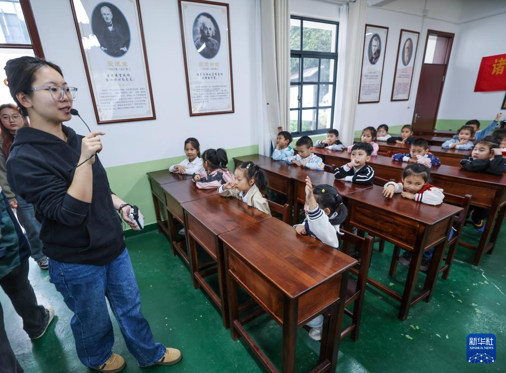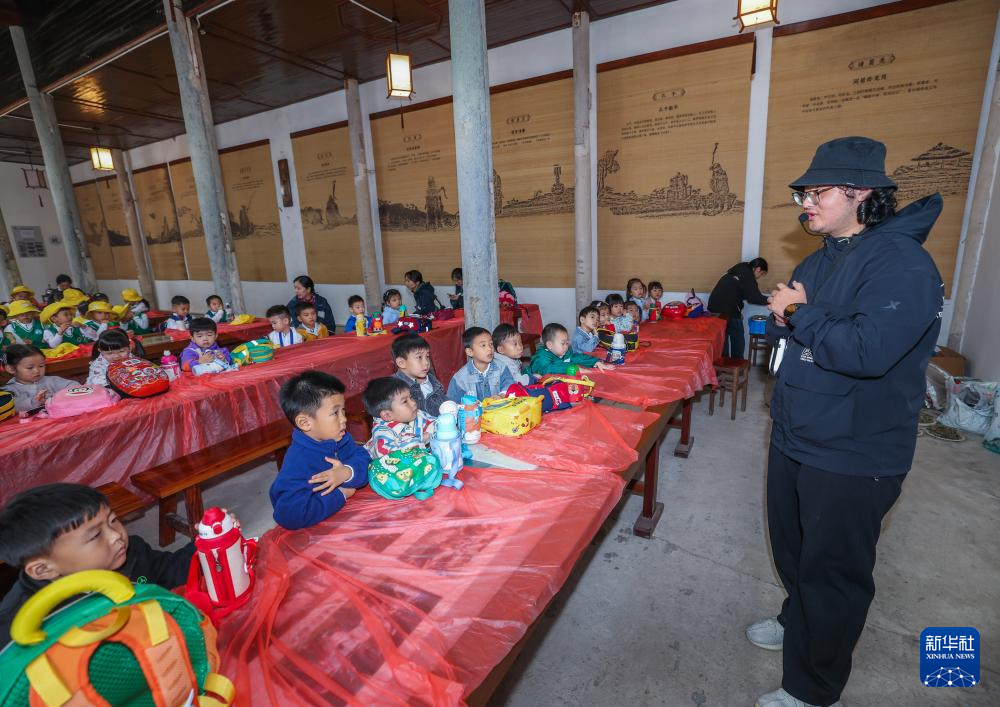 10月30日,参加研学游的诸暨荣怀和泰幼儿园的孩子们在璜山镇溪北村文化礼堂里上传统文化课。