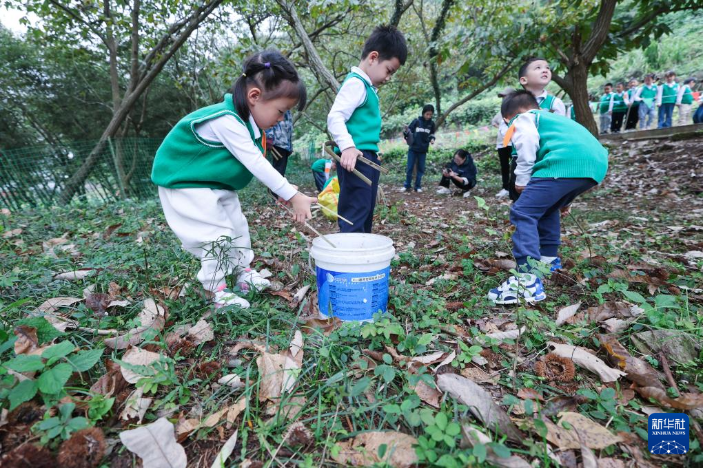 10月30日,参加研学游的诸暨荣怀和泰幼儿园的孩子们在璜山镇溪北村的板栗树林里捡板栗。