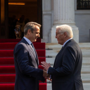 10月30日,在希腊雅典,希腊总理米佐塔基斯(左)与到访的德国总统施泰因迈尔握手。
