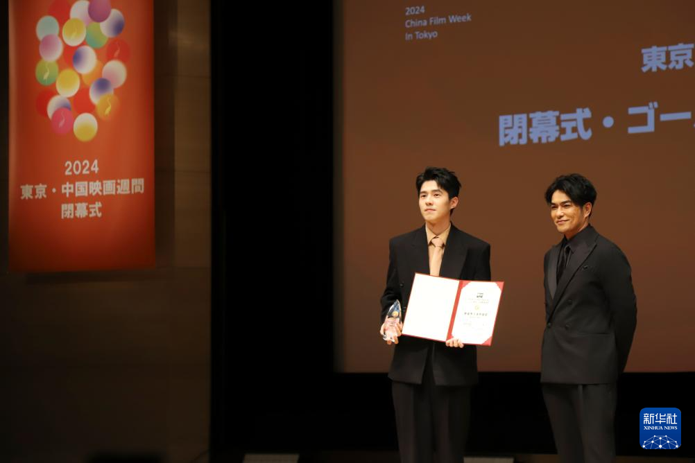 10月29日,在日本首都东京,演员刘昊然(左)凭借影片《解密》获得“金鹤奖”最佳男主角奖。