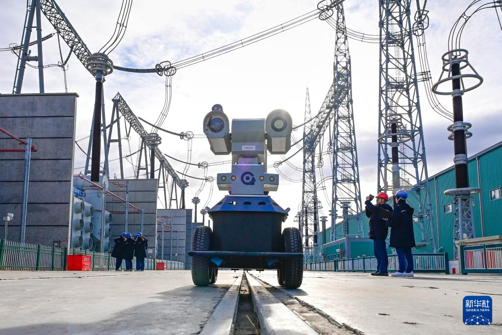 10月31日,机器人在张北—胜利1000千伏特高压交流工程胜利变电站巡检输电设备。