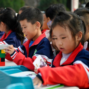 11月1日,银川市西夏区镇北堡镇华西希望小学学生在体验科普装置。