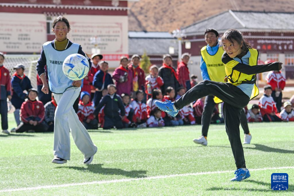 10月30日,红星女子足球队队员达瓦卓玛(右一)在校园足球班级联赛中射门。