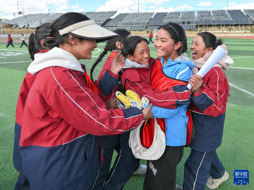 10月30日,红星女子足球队队员央拥措(右二)在代表自己班级取得学校足球赛胜利后和同学一起庆祝。