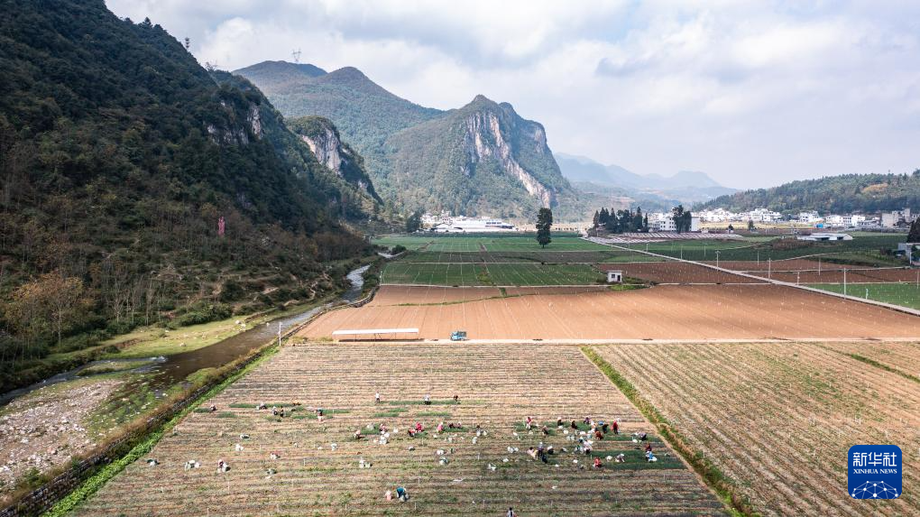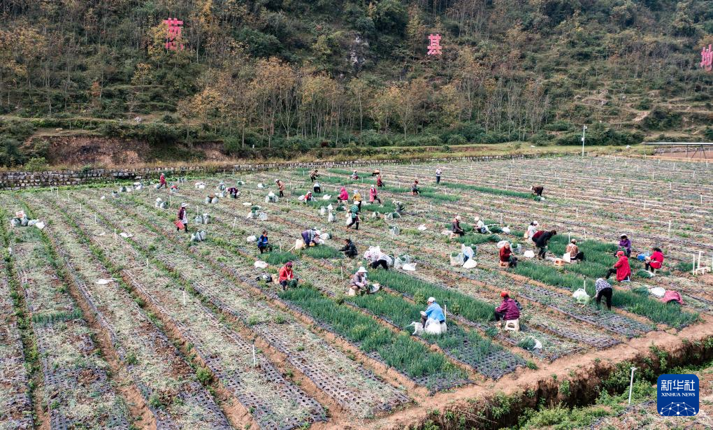 10月31日,村民在赫章县松林坡白族彝族苗族乡的香葱基地里采收香葱(无人机照片)。