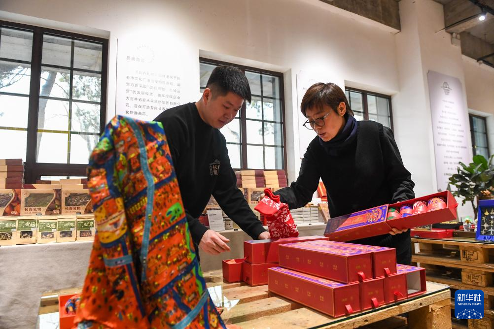 10月31日,在吉林省长春市“长春礼物”概念店,文创产品策划运营师史爽(右)与同事沈迪研究改进设计方案。
