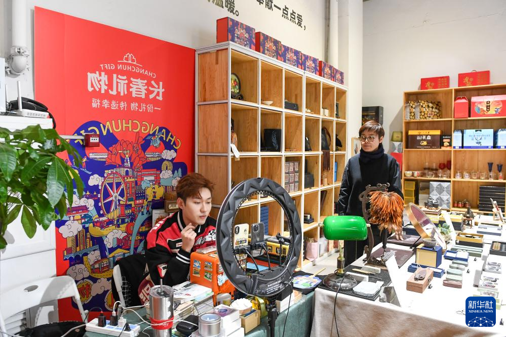 10月31日,在吉林省长春市“长春礼物”概念店,文创产品策划运营师史爽(右)观看线上直播工作。