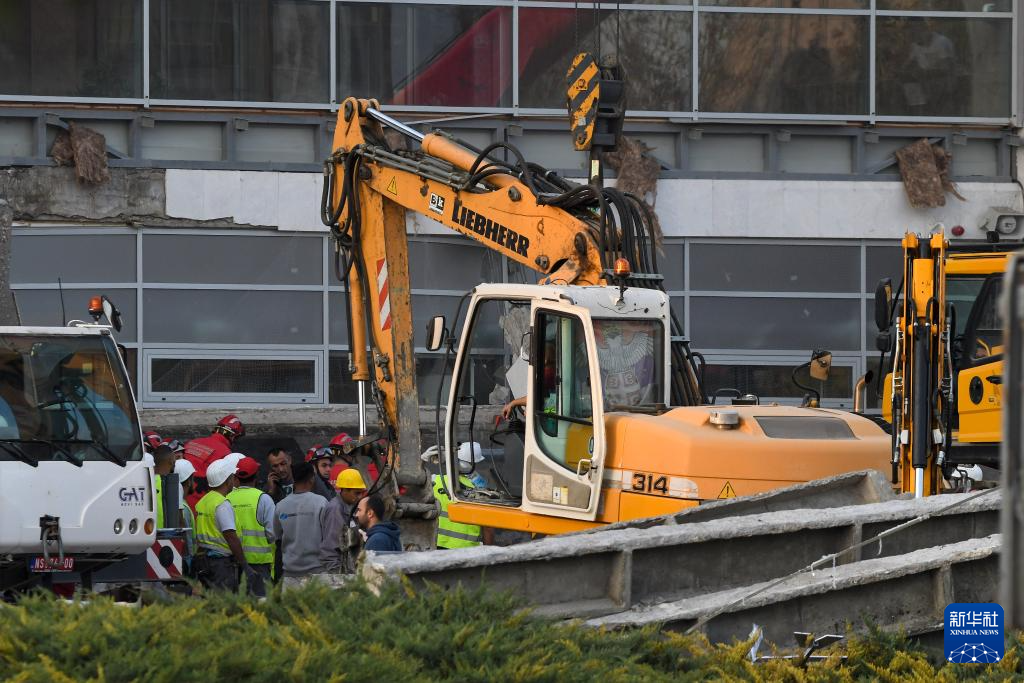11月1日,在塞尔维亚中北部城市诺维萨德,救援人员在火车站雨棚倒塌事故现场工作。