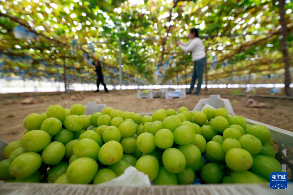 11月2日,河北省唐山市丰南区大齐各庄镇的农民在果园里采摘葡萄。