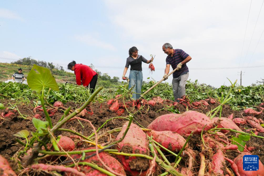 11月1日,湖南省永州市新田县枧头镇农民在田间收获红薯。