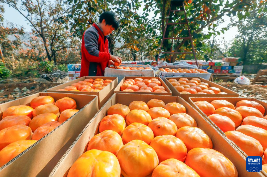 11月1日,河北省遵化市地北头镇羊角峪村农民在场院整理装箱的柿子,准备外运。