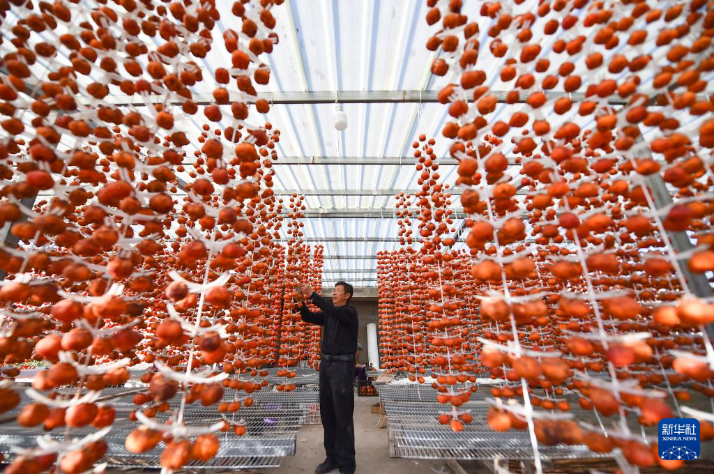 11月2日,河南省洛阳市宜阳县盐镇乡农民在晾晒处理后的柿饼。
