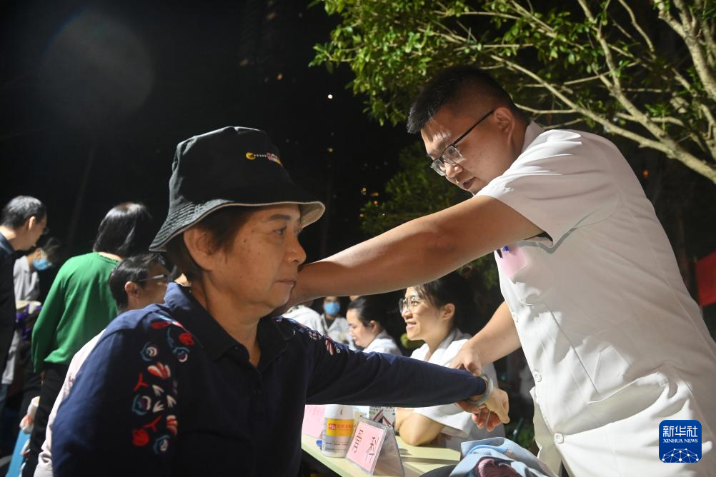 11月1日晚,在广西南宁市长虹路万科城居民小区,一名医务人员在给居民检查身体。