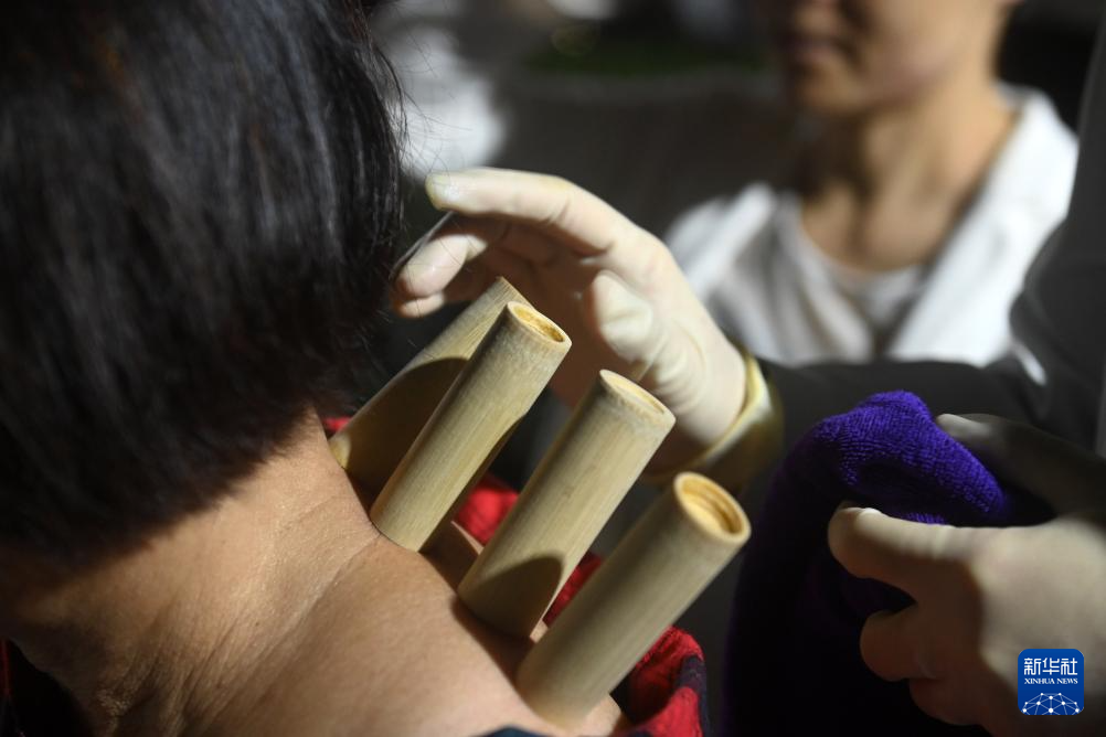 11月1日晚,在广西南宁市长虹路万科城居民小区,医务人员在给居民拔罐。