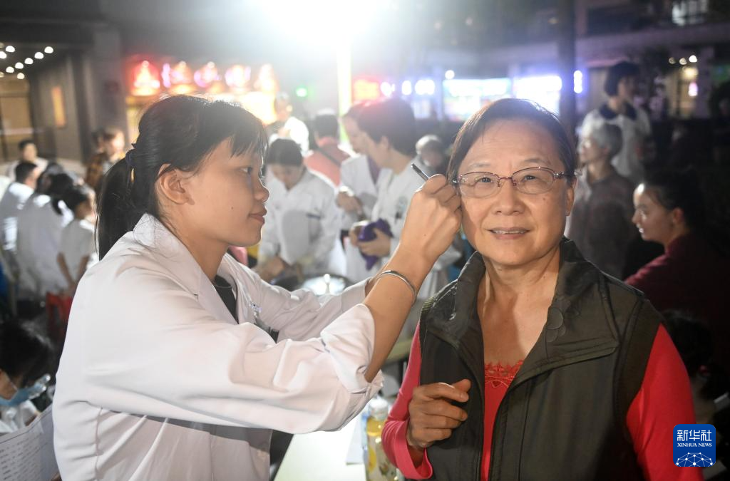11月1日晚,在广西南宁市长虹路万科城居民小区,医务人员在给居民耳部穴位贴耳豆。